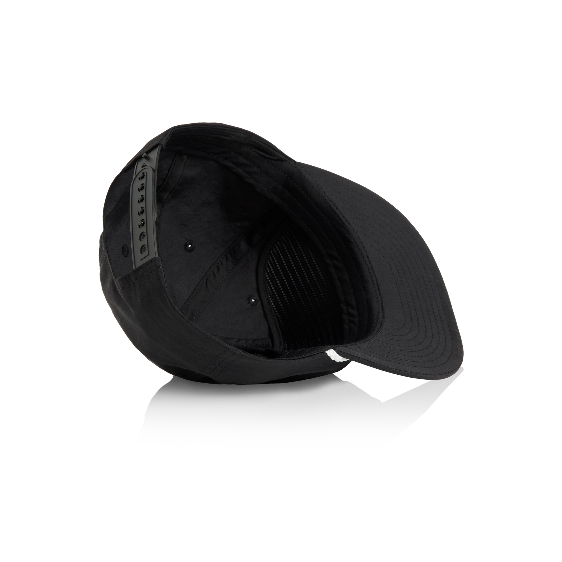 Single panel at front, quick dry fabric, plastic snapback, tonal under-peak lining, mesh structure support, contrast matte nylon rope at front of crown